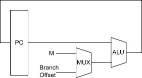 In this image, the PC value is either loaded with an updated version of itself, or else it is loaded with a new Branch Address. For simplification we do not show the control signals to the MUX.