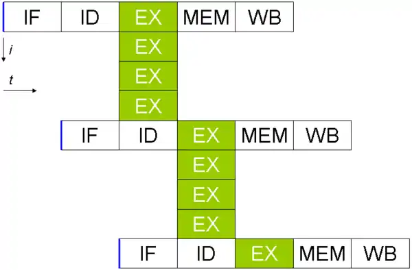 As this diagram shows, each EX stage is a new set of data from the first instruction being loaded into the execution core. The next instruction will not be fetched until all the data has been acted upon.