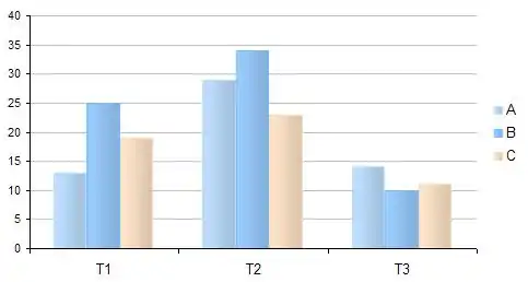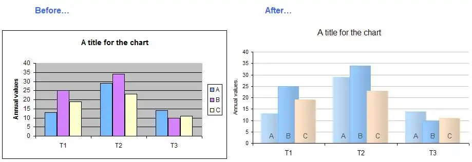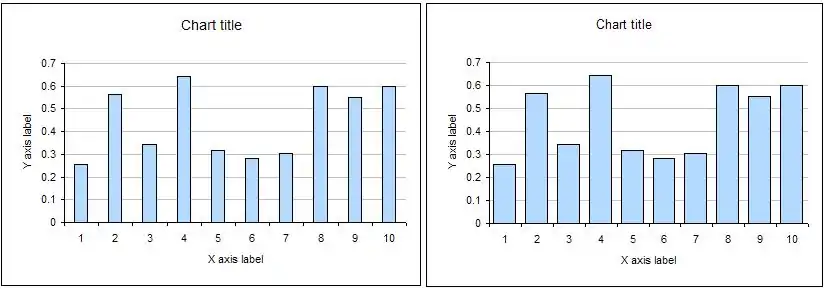 Here is a single series bar chart. Note how on the left, the gaps between bars are wider than the bars, which distracts your eye. If you narrow the gap, as on the right, it improves the look of the chart. (Do this by selecting the series, click Options tab, and reduce the gap width). If the bars get too fat when you reduce the gap, you can make the chart narrower until the bars look right.