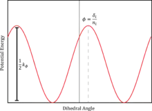Where k is the rotational barrier of the system, n is the periodicity as the rotations repeat around 360 degrees, ɸ is the dihedral angle, and δ is the offset of the function