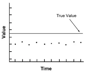 Measurements and calculations can be characterized with regard to their accuracy and precision. Accuracy refers to how closely a value agrees with the true value. Precision refers to how closely values agree with each other. The following figures illustrate the difference between accuracy and precision. In the first figure, the given values (black dots) are more accurate; whereas in the second figure, the given values are more precise. The term error represents the imprecision and inaccuracy of a numerical computation.