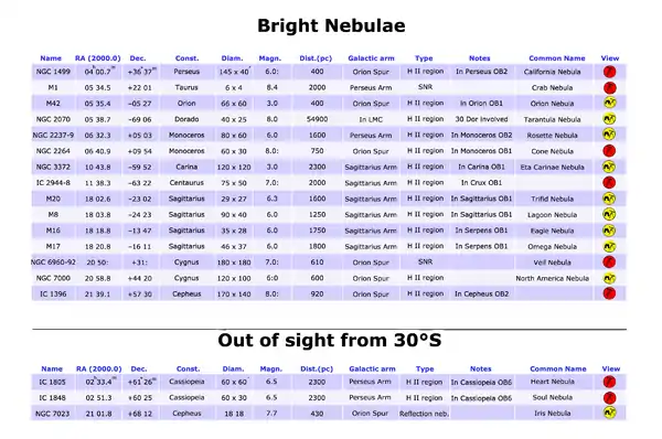 - Galactic arm: the spiral arm of the Milky Way in which the nebula is located.