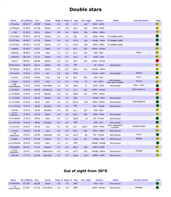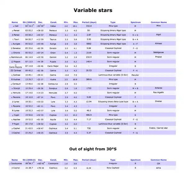 - Spectrum: the spectral class of the star. In eclypsing binaries, the spectra of both the components are indicated; in pulsating variables, the variation of the spectrum is showed.
