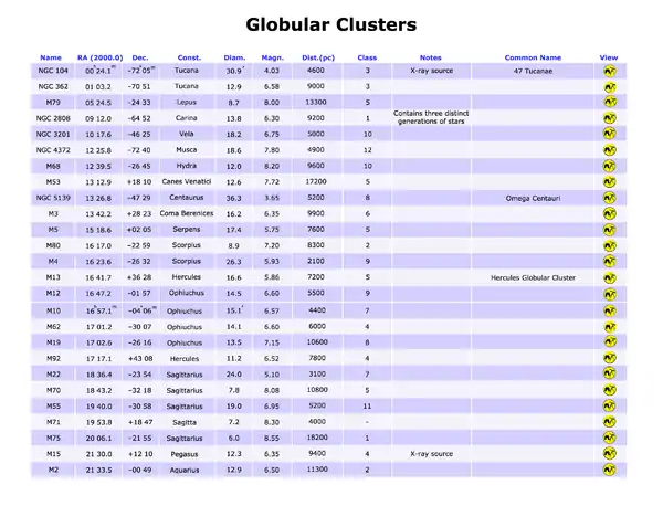 - Class: concentration class of the globular cluster based on the system developed by H. Shapley in 1927. The values range from 1 to 12; the smaller is the number, the higher is the concentration of stars toward the centre of the cluster.