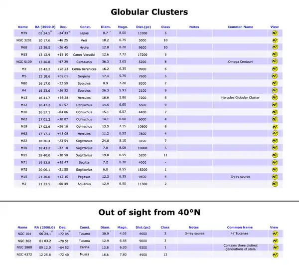 - Class: concentration class of the globular cluster based on the system developed by H. Shapley in 1927. The values range from 1 to 12; the smaller is the number, the higher is the concentration of stars toward the centre of the cluster.