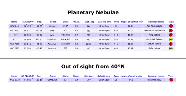- Dist.(pc): approximate distance of the nebula, expressed in parsec. To obtain the distance in light-years, moltiply for 3.26.