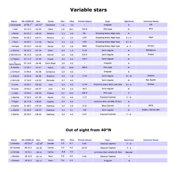 - Spectrum: the spectral class of the star. In eclypsing binaries, the spectra of both the components are indicated; in pulsating variables, the variation of the spectrum is showed.