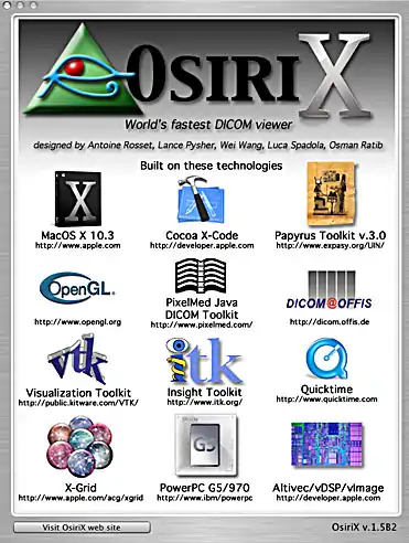 This selection brings up a splash screen showing which version of Osirix you are currently using. It also includes a button linking back to the main OsiriX website.