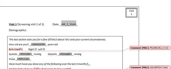 - The Word merge also produces a marked-up CRF with code lists for data analysis