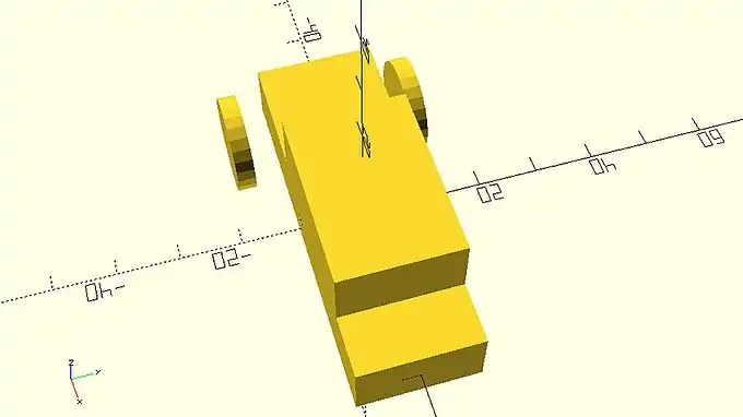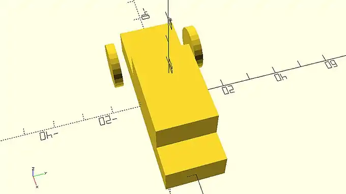 The model that you just created looks like the body of a car that has bad aerodynamics. That’s ok. You will be making the car look a lot more interesting and aerodynamic in the following chapters. For now, you are going to use the cylinder primitive and the rotate transformation to add wheels and axles to your car. You can create a wheel by adding a third statement that consists of the cylinder command. You will need to define two input parameters, h and r. The first one will be the height of the cylinder while the second one will be its radius.