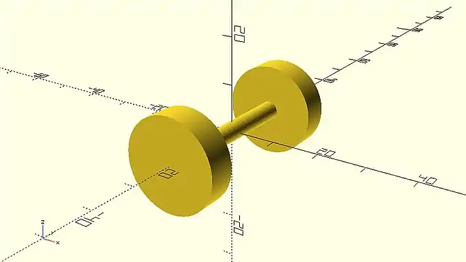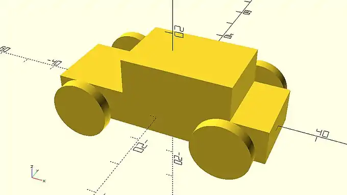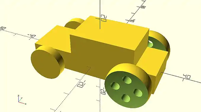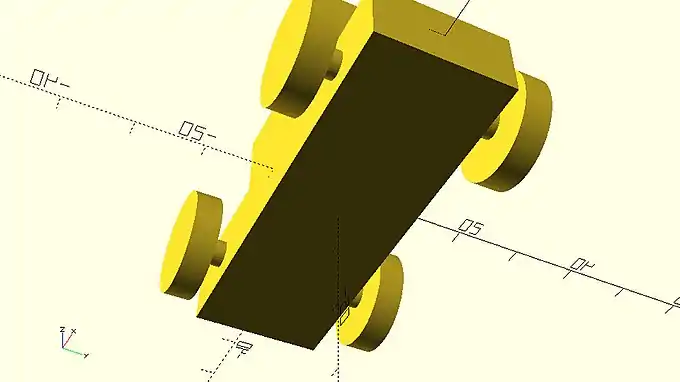 You should notice that something unexpected happened. A wheel has been created at the origin. This is the object of the simple_wheel script. When you use include, OpenSCAD treats the whole external script that you are including as if it was a part of your current script. In the simple_wheel.scad script, aside from the simple_wheel module definition, there is also a call to the simple_wheel module which creates a wheel object. As a result of using the include command this object is also created in the car’s model. This is something that you are going to change by using the use instead of the include command, but don’t bother about it for a moment.