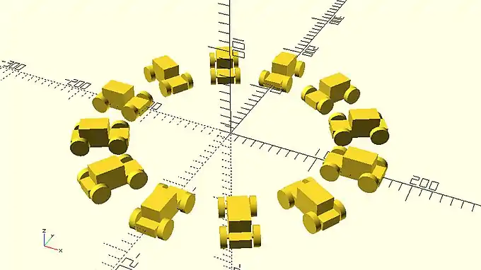 Addition, subtraction, multiplication and division is represented in OpenSCAD with the signs +, -, * and /. Apart from these fundamental operations there is also a number of additional available mathematical operations that can be useful when building more complex models. One example of this are the cosine and sine functions that you used to define a circular pattern of cars. Specifically, you used the cosine and sine functions to transform the polar coordinates of each car into cartesian coordinates in order to translate it in its proper position. You can find all available math functions briefly listed in the cheat sheet.
