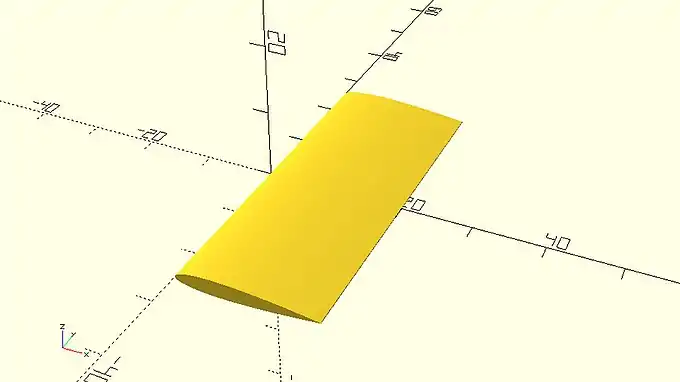 | All you have to do now to create a wing out of the airfoil is to apply a linear_extrude command on the 2D airfoil profile. Create a module named naca_wing that does that. The naca_wing module should have two additional input parameters compared to the naca_airfoil module, span and center. The span parameter should correspond to the height of the extrusion while the center parameter should dictate whether the extrusion is executed along only the positive direction of the Z axis or along both directions. The span parameter shouldn’t have a default value while the default value of the center parameter should be false. Can you use the naca_wing module to create the following wing? The following wing has a span of 50 units, while the airfoil of the wing has a chord of 20 units, a maximum thickness of 0.12 and 500 points on each half. You will have to additionally use a rotation transformation to place the wing as in the following image. |