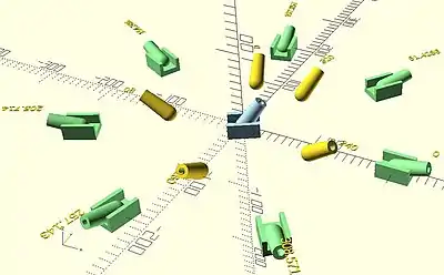 rotate([0,0,110]) RotaryCluster(100,4.5) aim(35)cannon();