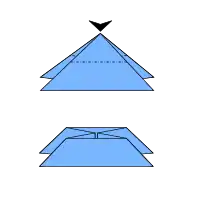 The open double sink is equivalent to making an open sink, and then open-sinking the point in the opposite direction. It is a sinked analog of the crimp fold. When made in a single step (after pre-creasing), it can be easier to make than a single open sink, because it does not require neatly reversing the point. The open double sink is used in many box-pleated models.