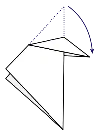 The swivel fold is difficult to describe as the term is loosely defined and there are so many different versions that could be called "swivel folds". However, generally swivel folds consists of swivelling a flap of paper at a certain point or vertex in order that the raised edge of the flap will lie on the edge of the flap that doesn't move: