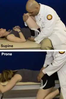 | External rotation | Flex the hip and flex the knee while externally rotating the hip to its barrier | ![]() Spencer's technique of the hip - external rotation |