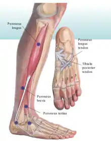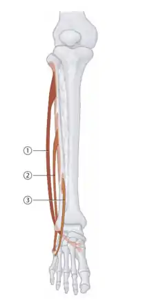 Plantarflexion, eversion | Fibular nerve (L5, S1) | ![]() Fibularis (Peroneus) muscles: 1 - longus, 2 - brevis, 3 - tertius |