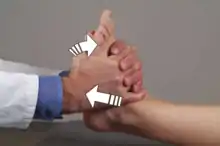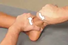 | Posterior Fibular Head Post-Isometric Muscle Energy: The patient is supine. The physician places the hand closest to the knee in the popliteal fossa so that the metacarpophalangeal joint of the index finger approximates the posterior fibular head and, with the other hand, externally rotates the patient's foot until the restrictive barrier is reached. The patient is told to internally rotate the foot and the physician will resist the motion with an isometric counterforce. In each respective iteration, the patient is taken further into the restrictive barrier. | ![]() Posterior Fibular Head Post-isometric Relaxation Muscle Energy |