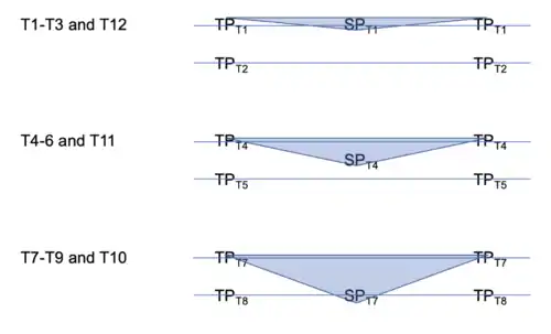 - T1-T3, T12: spinous process is located at the level of corresponding transverse process