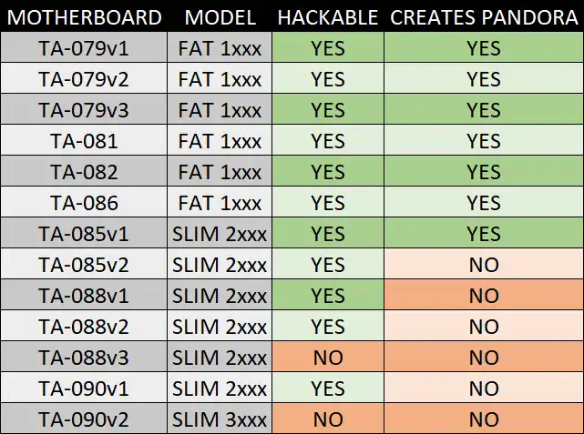 | Motherboard | PSP Model | Generation | cIPL | Perma Patch | Temporary CFW (LCFW) | Create Pandora | Pandora Unbrick | Lowest Possible OFW |