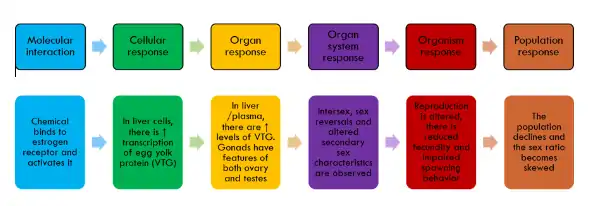 Adverse Outcome Pathways (AOPs) encompass toxicity pathways and beyond. That is, they include chemical-molecular interactions and cellular changes, and determine how this leads to changes in organs, organisms, and populations. In Figure 5 an AOP has been drawn for a male fish exposed to a chemical that activates the estrogen receptor. At the cellular stage this could lead to the transcription and production of abnormal proteins. These proteins could cause both ovaries and testis to develop, altering the secondary sex characteristics of the fish and impairing its fertility. The sex ratio could become skewed if many males in a population become feminized and infertile11.