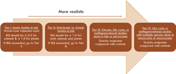 Tiered Testing: A toxicity testing method where lower tiered studies (representing simple worse-case scenarios) are followed by higher tiered studies (representing complex realistic scenarios).
