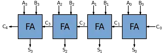 Bear in mind that the result will only be complete when the carry output have registered in each of the stages in turn. This ripple effect is why this kind of adder is called a ripple carry adder. This takes a small amount of time, and for large (32-bit or more) adders it may take several hundred nanoseconds, which may be a problem if high speed is needed.