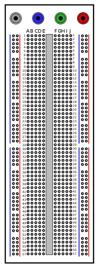 The breadboard (also called a protoboard) is used to create circuits without soldering components together. The pins are connected vertically along the grey and red lines and horizontally in the sections in between. Note that they do not connect across the gap in the center.