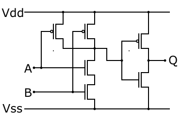 The truth table for one of the four gates is shown to the right. For more information about the AND gate in general, see this module. The arrangement of the CMOS components is shown below: