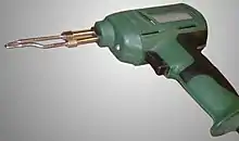 Soldering is the use of a conductive substance with a low melting point (solder) to electrically connect components together. It is frequently used to join wires to leads of components such as switches or to join components of all kinds to a printed circuit board. The primary tool used for applying solder is a soldering iron, a device whose metal tip heats to temperatures well above the melting point of solder. This is used to melt the solder and allow it to flow into a joint.