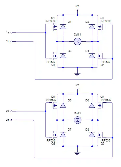 However, this circuit cannot drive a stepper motor by itself, as the logic outputs cannot supply nearly enough current. Some sort of amplification is needed. A dual H-Bridge arrangement can provide the necessary current and voltage reversal: