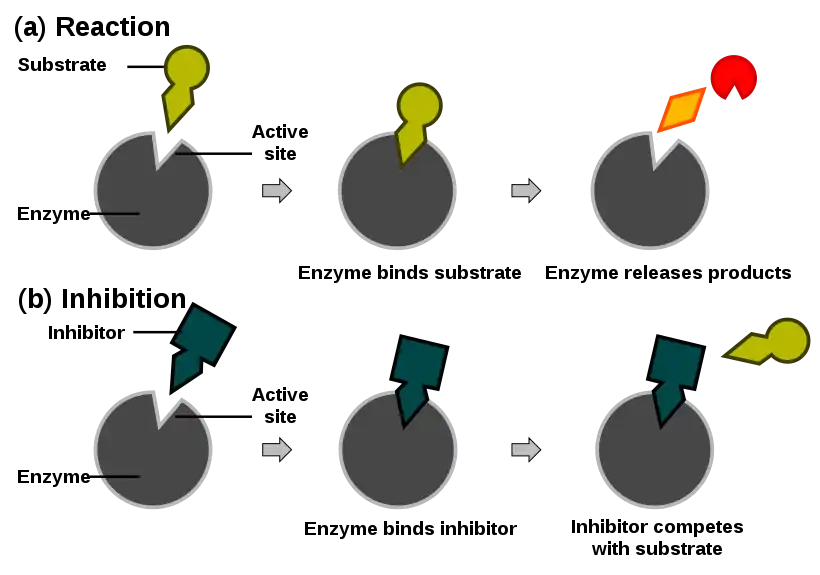 Although the active site of an enzyme is highly specific, it is possible that molecules with similar shape to the substate to bind to the active site. Active sites bounded to a molecule will interfere with enzyme reaction. Therefore, the possibility of substrates bind to active sites are lower, thus, known as competitive inhibition. However, competitive inhibition happens only when similar about of molecule and substrate are present. In competitive inhibitors, enzymes can only bind to either the substrate or inhibitor but not both. In addition, during competitive inhibition, concentration of substrate increases as the maximum velocity remains constant.