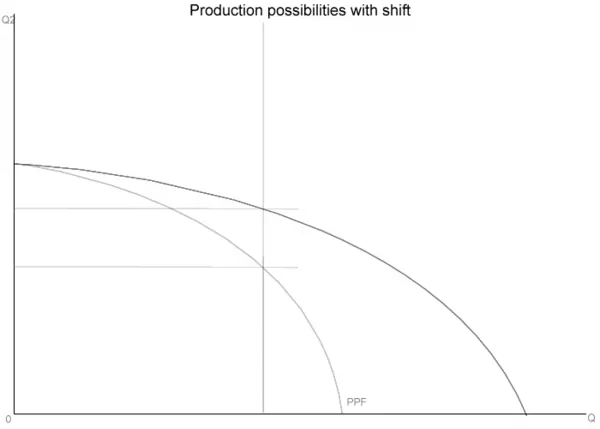When a change in the economy causes more or less of a good to be produced when others are held constant, that is considered a shift in the one good's production possibility. The positive version shifts the frontier outward along the axis the good is placed at, so here an increase in good 1's production possibility stretches the PPF along the x axis. It is possible for that to actually increase production of good 2, depending on how society apportions its resources.