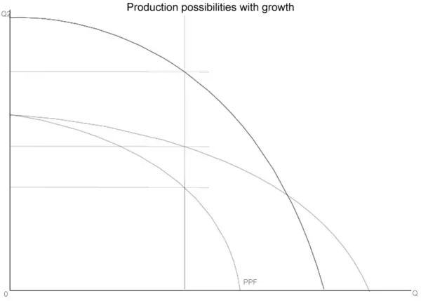 General economic growth increases all of the available goods (both in this case). The growth does not have to be proportionate, nor even hold the same shape, as this graph demonstrates.
