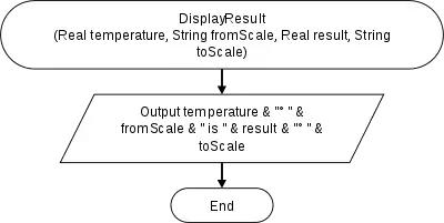 Function DisplayResult (Real temperature, String fromScale, Real result, String toScale)