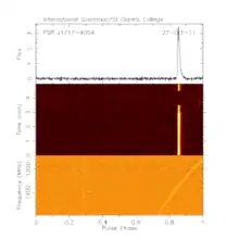 In the figure we provide an example folded pulse profile from the PULSE@Parkes outreach project for PSR J1717-4054. The top panel shows the pulse profile. Note that for most of the pulse phase the profile is simply noise. The actual pulse is observed around pulse phase 0.8. In this case the position of the pulse is arbitrary, but often backend instruments use the pulsar timing model in order to place the pulse at phase 0. The central panel shows individual subintegrations (started at time 0 at the bottom of the plot and increasing upwards). In this case the pulse profile amplitude is shown using the colour scale. This pulsar is an intermittent pulsar. Note that the pulsar is not detectable near the end of the observation, but it switches "on" again just before the end. The bottom plot shows the pulse (in colour scale) as a function of phase (x) and observing frequency (f). Note that the pulse is dispersed in frequency.