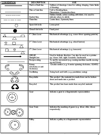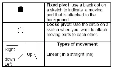 An example of the type of graphic expected from learners in a linkage mechanism (Inputs and outputs must be clearly indicated. The convention for fixed and loose pivots must be followed)
