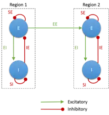 The model (see figure) involves recurrent connections between the excitatory (E) and inhibitory (I) populations in each region. There is an excitatory connection from E to I, denoted EI, and an inhibitory connection from I to E, denoted IE. There are inhibitory self-connections on E and I, which are referred to as SE and SI respectively. The connections between regions (EE) link the excitatory populations in each. In its current implementation in SPM12, the values assigned to these connections are either estimated when fitting the model to the data (EE and IE), or have fixed values (EI, SI, SE; see table below). The EE extrinsic connections are based on the off-diagonal of the A-matrix (plus modulatory input B if available), whereas the IE self-inhibitory connections take their value from the diagonal of the A-matrix (plus modulatory input B if available).