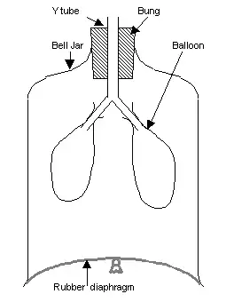 This simple Bell jar model lung can be used to demonstrate the basic principles of breathing. The model should be assembled as in the diagram. A swimming cap makes a suitable diaphragm. The cap can be attached to the bottom of the bell jar, and the balloons can be attached to the Y shaped tube, with elastic bands or plastic coated wire.