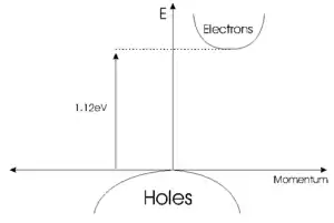 The total energy of an electron is given by its momentum and its potential energy. To move an electron from the conduction band to the valence band, it may need to undergo a change in potential energy and a change in momentum. There are two basic material types, in-direct and direct band gap materials. In an indirect band gap material, such as silicon, shown in figure 4, to move into the valence band, the electron must undergo a change in momentum and energy[1]. The chance of this event is small. Typically this process is achieved in several steps. The electron will first move to a trap site in the forbidden band before moving into the valence band. A change in potential energy will result in the release of a photon, while a change in momentum will produce a phonon (a phonon being a mechanical vibration which heats the crystal lattice).