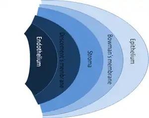 - Epithelium: A layer of epithelial tissue covering the surface of the cornea.