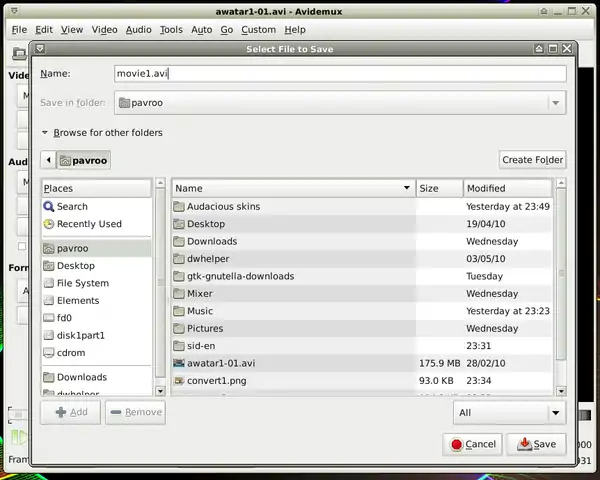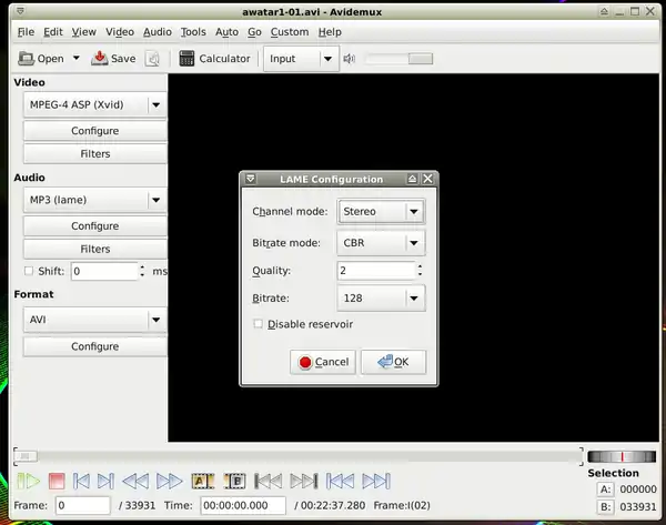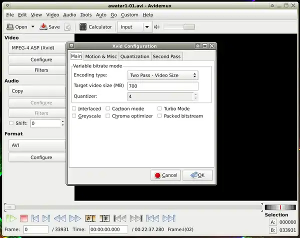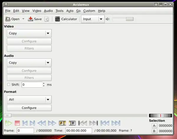 - Run it: Menu-> Multimedia-> Avidemux (GTK+).
