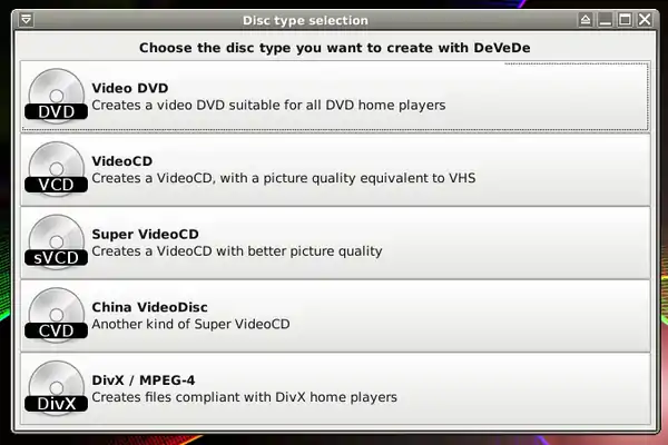 - Using DeVeDe you can create video DVD, VCD, sVCD, CVD and DivX.