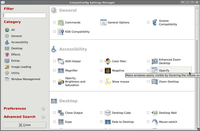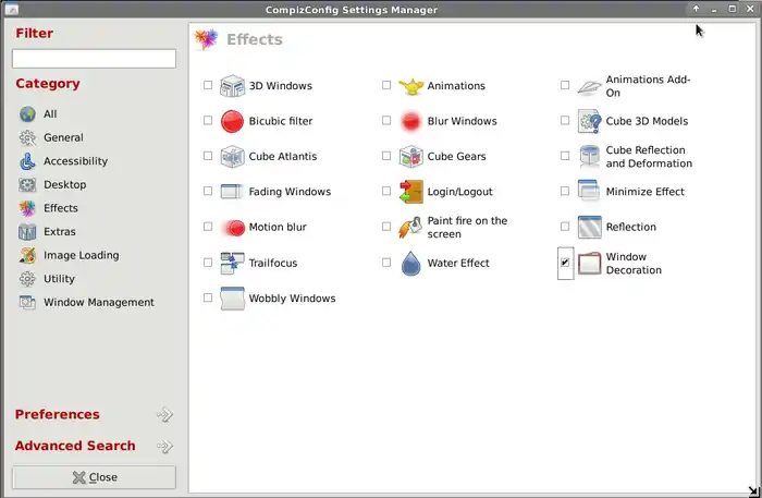 - When Compiz is loaded, you can choose your favorite effects, just run from the icon menu: Settings Manager.