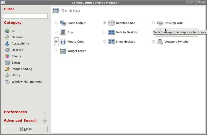 - a. Desktop-> mark "Desktop Cube" and "Rotate Cube".
