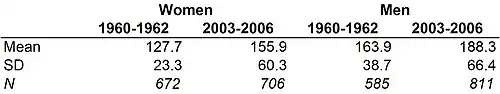 5.1. From descriptive statistics to inferential statistics Like most people around the world, Americans are getting fatter. This is a serious problem, because obesity is closely linked to a range of health problems including diabetes, joint problems, and heart disease. Many people also consider obesity unattractive, and want to weigh less than they do. According to data from the US Health and Nutrition Examination Survey (NHANES), the mean weight of Americans aged 20-29 is 155.9 lbs. for women and 188.3 lbs. for men. These figures are up dramatically from the first time the NHANES was conducted. Then, in the early 1960s, the means for American women and men in the 20s were 127.7 lbs. for women and 163.9 lbs for men. Means and standard deviations for the weights of American twentysomethings, broken down by gender, are reported in Figure 5-3.