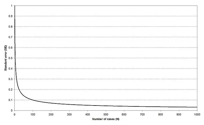 5.4. Sample size and statistical power (optional/advanced) The calculation of the standard error of a mean in a mean model is relatively straightforward. It is equal to the standard deviation of the variable divided by the square root of the number of cases. The calculation of the standard error of a regression slope is much more complicated. Like the standard error of a mean, it depends on the regression error standard deviation and the number of cases, but it also depends on the amount of spread in the independent variable. From a conceptual standpoint, the standard error of the slope is like stretching out the standard error of the mean of the dependent variable over the range of the independent variable, much like the values of the independent variable are spread over the range of the independent variable in Figure 4-10. The calculation of the standard error of a regression intercept is even more complicated. With all parameters, though, the standard error declines with the square root of the number of cases. This means that you can make more accurate inferences when you have more cases to work with. Because of the square root relationship, the number of cases is usually more important than the amount of model error for achieving a low standard error. Even models with enormous amounts of error (like the regression of Taiwanese democracy ratings on age) can have very low standard errors for their parameters, with enough cases. The relationship between the number of cases used in a mean model (N) and the standard error of the observed mean (SE) is depicted graphically Figure 5-8. The line on the graph can be read as the standard error of the mean of a variable when the standard deviation of the variable is equal to 1. The standard error of a mean goes down very rapidly as the number of cases rises from 1 to 20. Between 20 and 100 cases the standard error of a mean also declines rapidly, but not so steeply as before. After about 100 cases the standard error of a mean continues to fall, but at a very slow pace. Broadly speaking, once you have 1000 or so cases in-hand, enormous numbers of additional cases are needed to make any real difference to the standard errors of the mean. Sample sizes of N = 800 - 1,000 cases are sufficient for most social science applications.