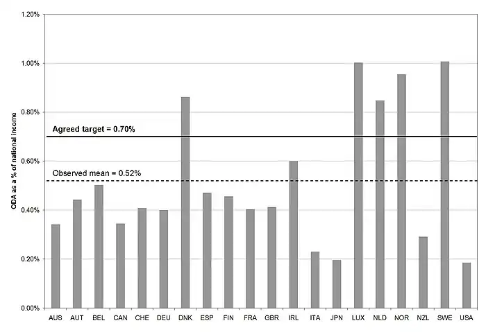 5.5. Case study: Aid generosity and the Monterrey Consensus At the 2002 United Nations International Conference on Financing for Development in Monterrey, Mexico the rich countries of the world made a commitment to raise their levels of foreign aid to 0.70% of their national income levels. Many of the richest countries in the world have done this. Figure 5-17 shows levels of rich countries' overseas development assistance (ODA) spending as a proportion of national income for 20 rich countries. Each country's level of foreign aid is represented by a bar. Descriptive statistics can be used to describe the observed distribution of ODA spending. The observed mean level of aid across all 20 countries is 0.52% of national income. This and the Monterrey target of 0.70% of national income are marked on the chart. The observed mean is 0.18% less than the target. Though the observed mean is well below the target level, is it possible that the true mean of ODA spending as a percent of national income might really be equal to 0.7%?