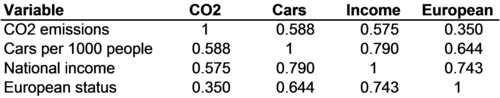 8.4. Correlation matrices (optional/advanced) Correlations are summary measures of the strengths of the relationships between variables. As such, they are useful even outside the context of regression models. Sometimes we just want to know what relationships exist among a group of variables. A table of all the correlations connecting a group of variables is called a correlation matrix. For example, the correlation matrix for the four variables included in Figure 8-6 (the regression model for CO2 emissions) are reported in Figure 8-14. The dependent variable from the regression model is listed first in Figure 8-14, followed by all the independent variables, but the order of variables in a correlation matrix doesn't have any effect on the correlations. The table or matrix is just a convenient way to organize all the correlations among all the variables.